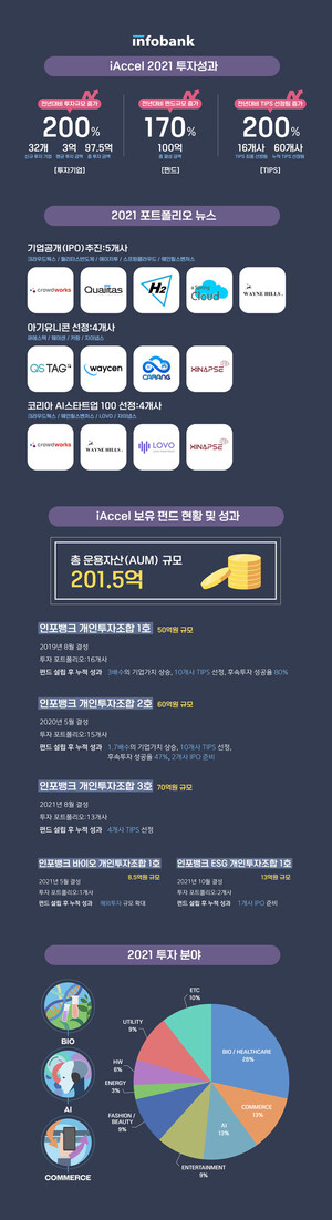 TIPS運営会社であり企業アクセラレーターであるインフォバンクiエクセル(ホン・ジョンチョル代表取締役)は、2021年の投資実績を発表した。インフォバンクiエクセル(以下、iエクセル)は2021年に合計32の有望なブックメーカーオッズ企業に約97億5000万ウォンを投資した。総投資規模は前年の総投資額約48億5000万ウォンに比べて2倍となり、個人法人も投資額も昨年の平均1億7,000万ウォンから3億ウォンと約18倍に増加した。投資規模の拡大に伴い、ファンドの規模も拡大しました。インフォバンク個人投資協会第3号(70億相当)とESGファンド(13億相当)が今年新設}