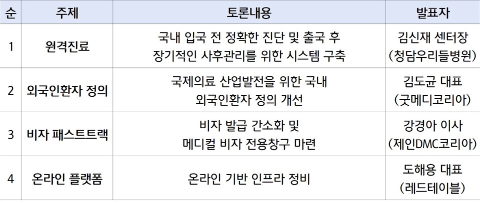 遠隔医療やビザのファストトラックなどの医療観光システムの改善、実績共有会議、優秀な協力団体の表彰などについて議論予定